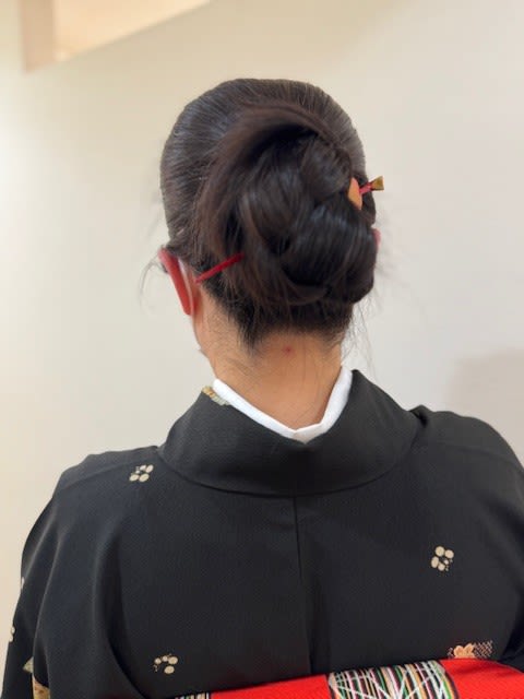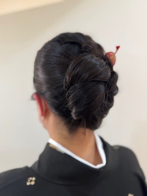▶︎ 髪はトップでふっくらと巻き上げ、